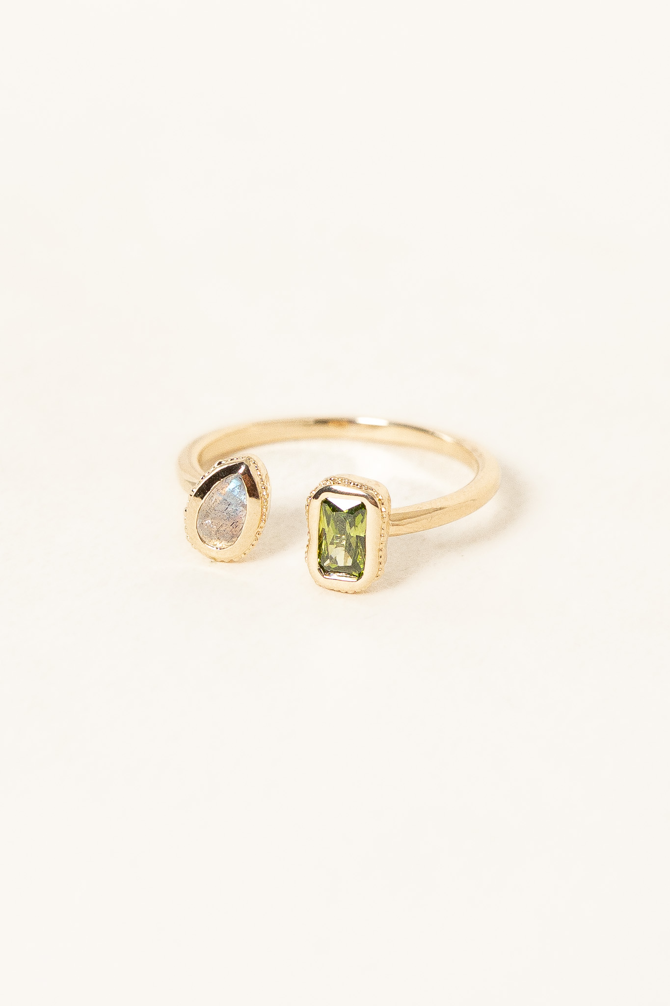 Bague dorée et ouverte, sertie de 2 oxydes de zirconium, en forme de goutte et rectangulaire