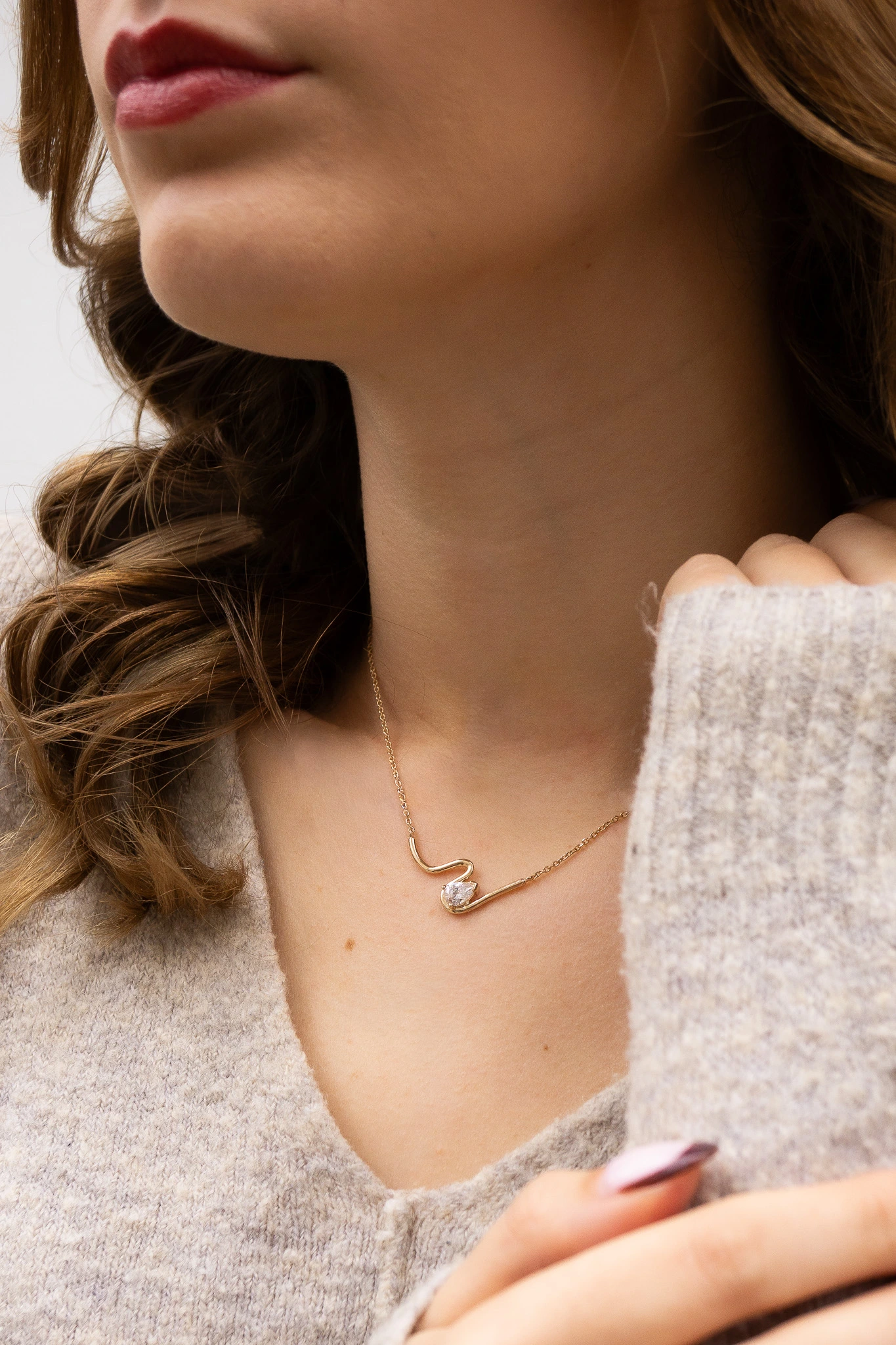 Collier doré, à maille fine, avec un pendentif, de forme ondulée et serti d’un oxyde de zirconium, en forme de goutte