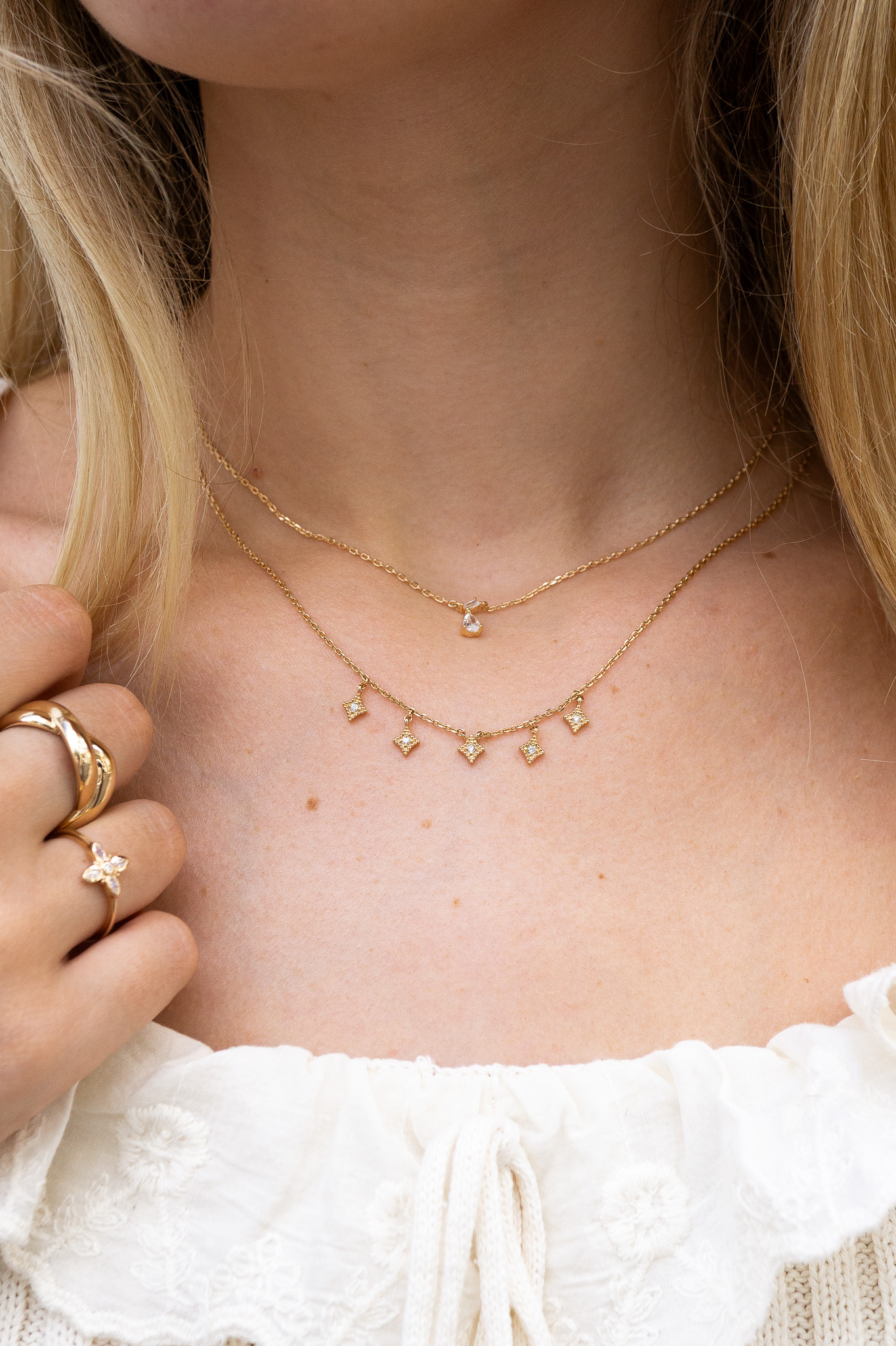 Collier doré à maille fine, avec des petites pampilles en forme de losange, serties d’oxydes de zirconium